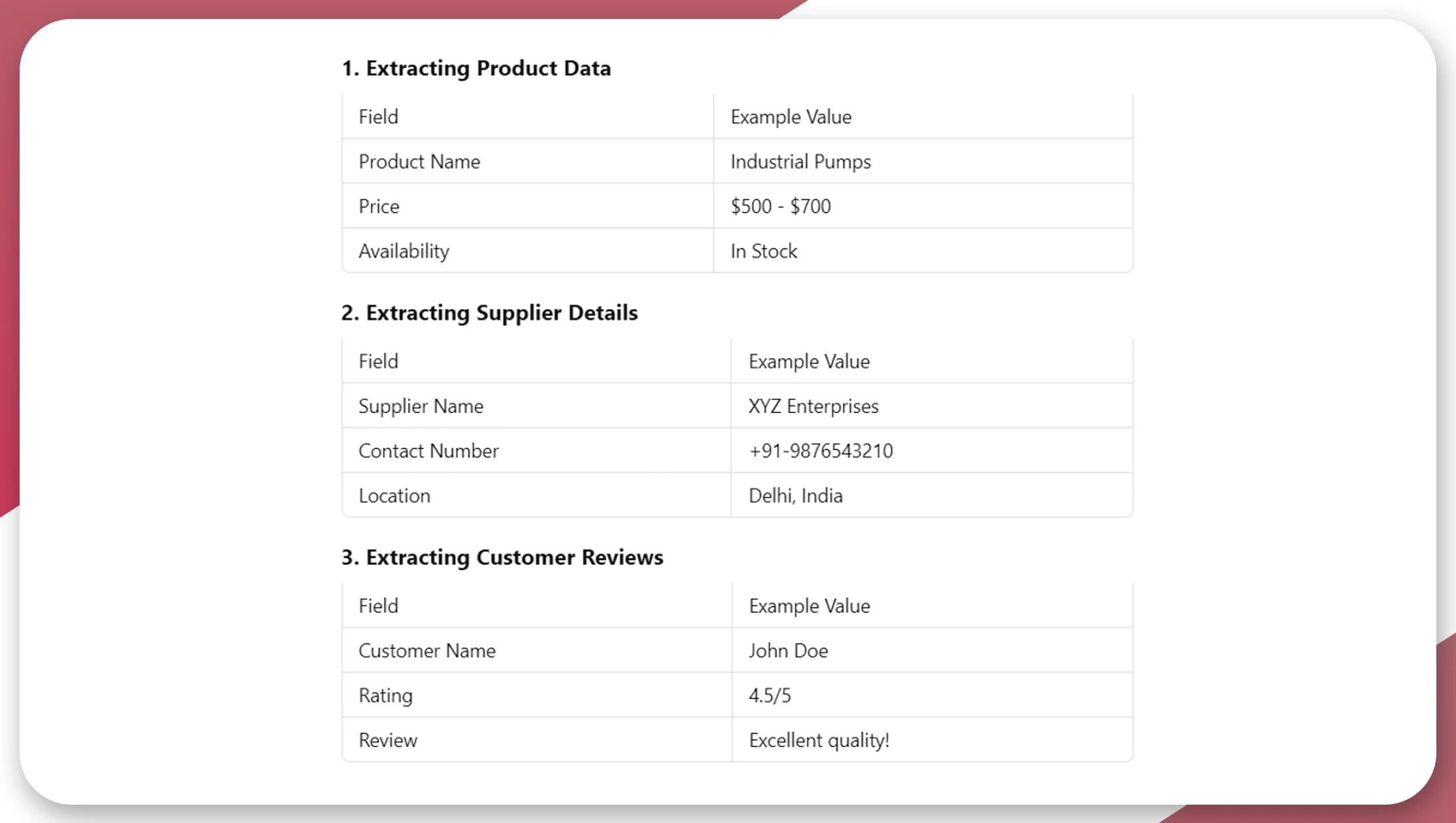 For customer-centric strategies, scraping IndiaMART customer reviews and ratings provides valuable feedback on product performance and customer satisfaction. This data can be used to enhance product offerings, improve customer experience, and boost brand loyalty.