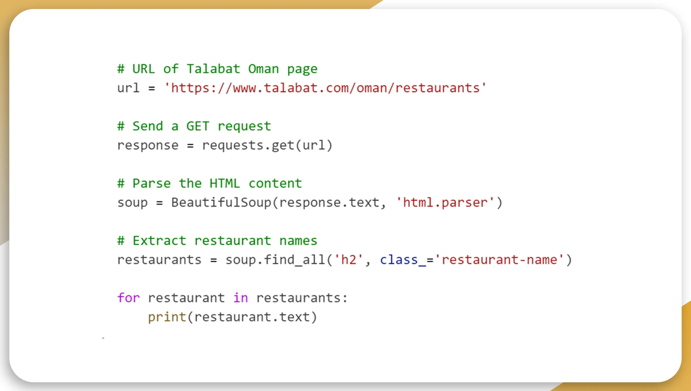 Here’s an example of how to scrape restaurant listings using BeautifulSoup: